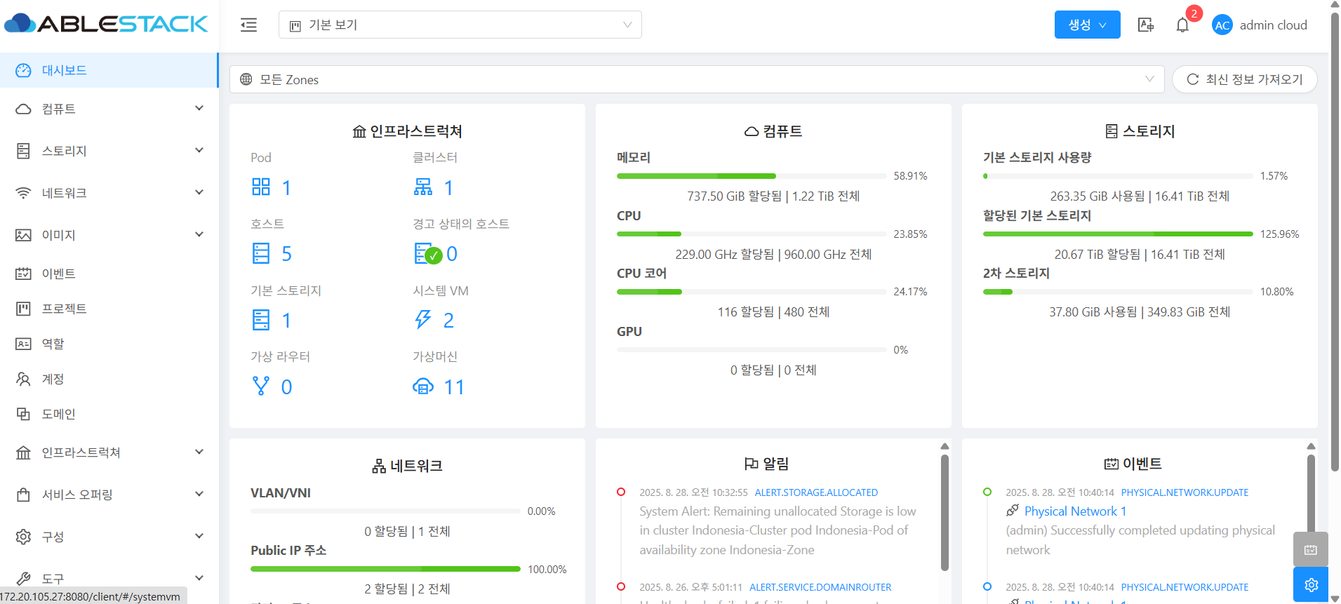 smlee 추가적으로 현재 OS 영역으로 960GB 요청을 했으나 몰드에서는 단위가 GiB 여서 960GiB로 생성된 상태 입니다. GB로 변환하면 1030.8GB 정도 되며, 480GiB 는 515GB 정도 되는것으로 판단됩니다. 해당 내용도 전달 예정이며, 정확한 용량으로 만들어야 한다면 가상머신을 새로 만들수도 있을거 같습니다.