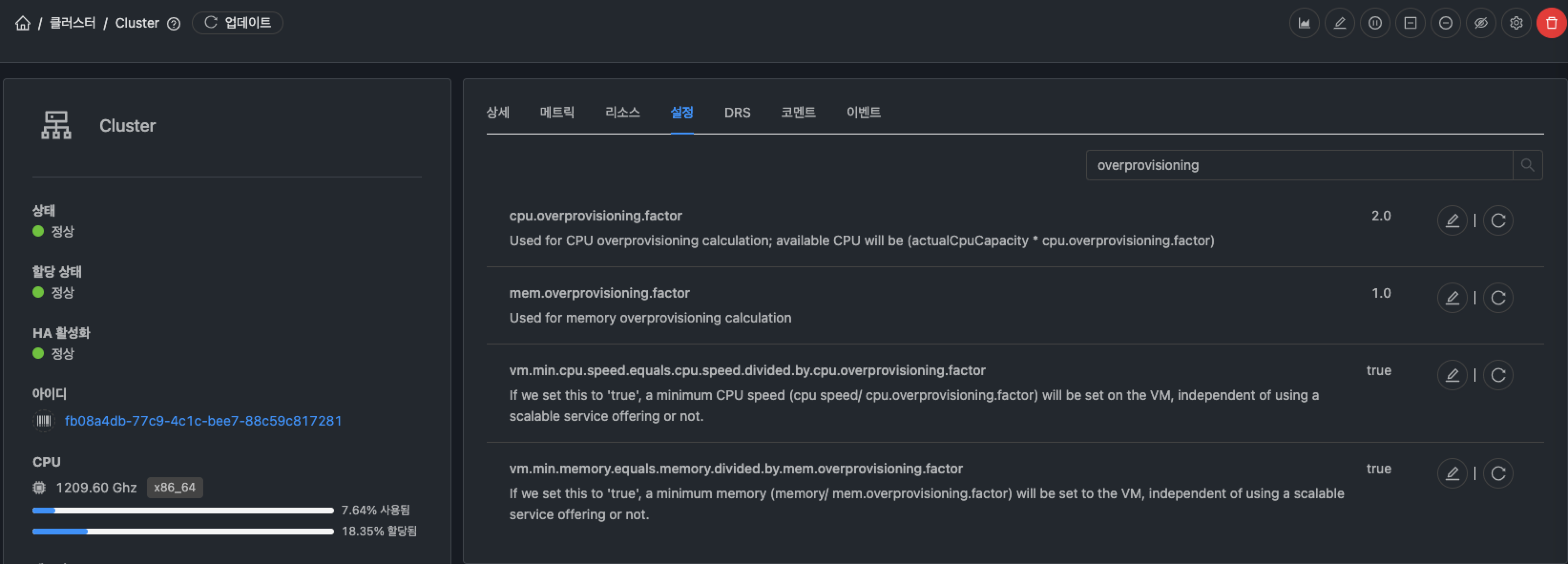 ABLESTACK은 물리적인 호스트의 자원을 효율적으로 사용할 수 있도록 CPU/Memory 자원을 가상화 하여 인프라를 제공합니다. 이 때 실제 물리적인 자원에 비해 더 많은 가상 CPU, 가상 메모리를 할당하는 것을 Overprovisioning 이라고 합니다. 해당 설정은 Mold의 인프라스트럭처 > 클러스터 메뉴에서 다음과 같이 설정할 수 있습니다.