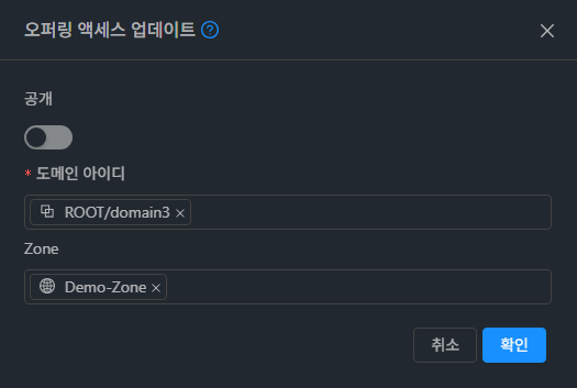 정책 생성 후 공개 범위를 변경하고자 하는 경우 오퍼링 상세 화면에서 "오퍼링 액세스 업데이트" 기능을 통해 특정 사용자용 오퍼링으로 변경할 수 있습니다. "오퍼링 액세스 업데이트" 기능의 대화상자는 다음과 같습니다.